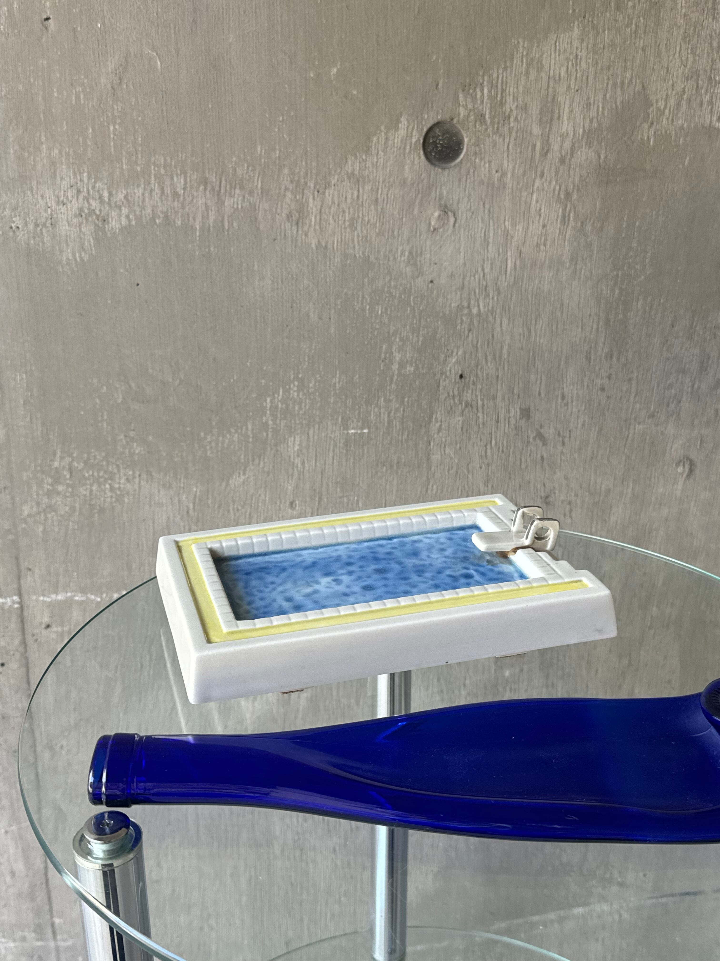 プールサイドに飛び込み台がある灰皿です。飛び込み台の部分にタバコが置ける仕様になっていますが、鍵やアクセサリーを置いて頂いても良いかと思います。飛び込み台部分に補修跡のようなものがあります。