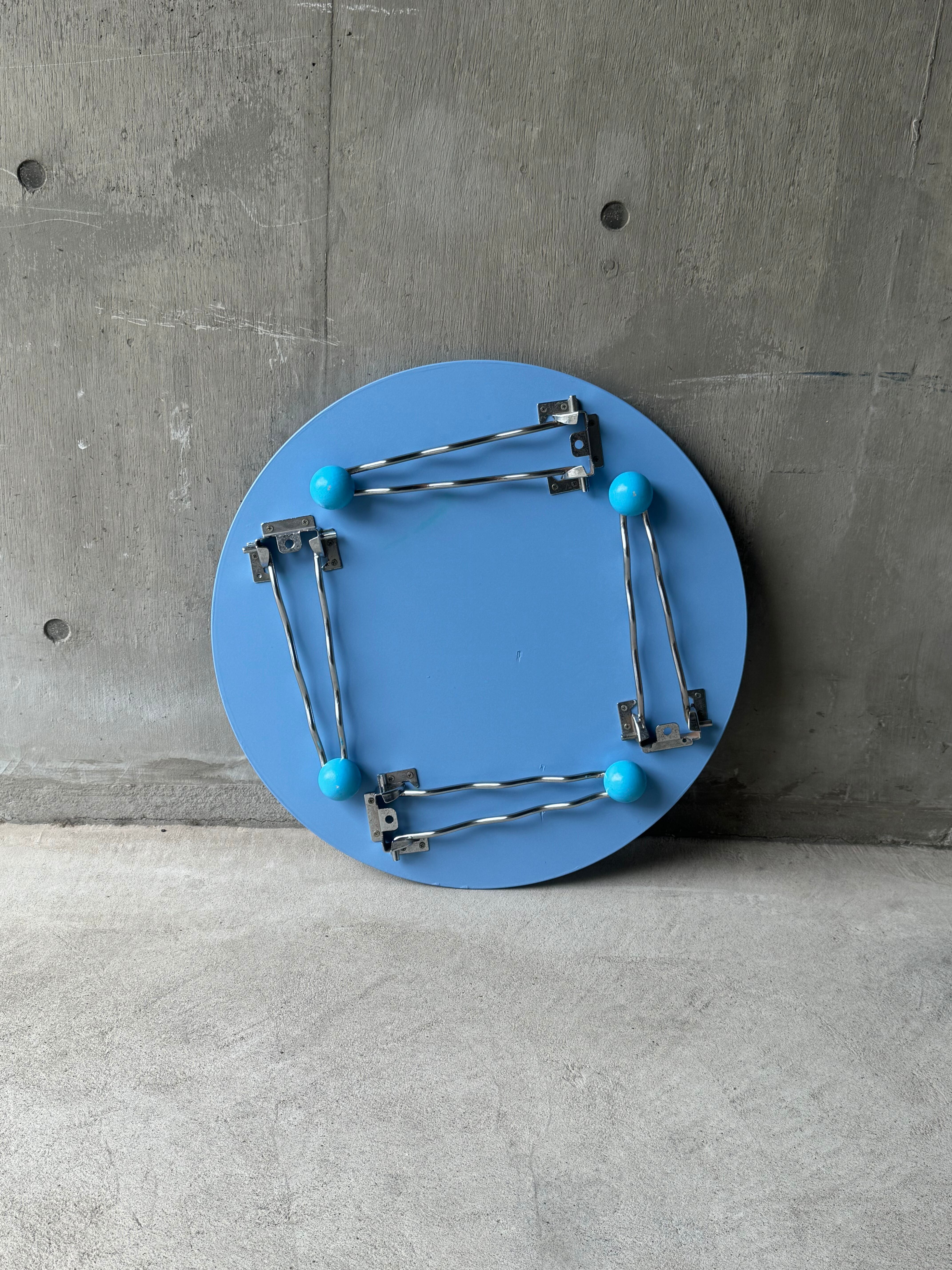 カラーリング、デザインともにポストモダンなサイドテーブルです。ウェーブの脚に球体、鮮やかな水色が良いです。折りたたみ式なので、友人が来た際にサラっと出したから最高かと思います。可愛すぎるので、常に出して置いて植物や可愛いライトなど置いてもらっても良いかと思います。天板に傷、凹み、リペイント跡、脚にサビ等ございます。