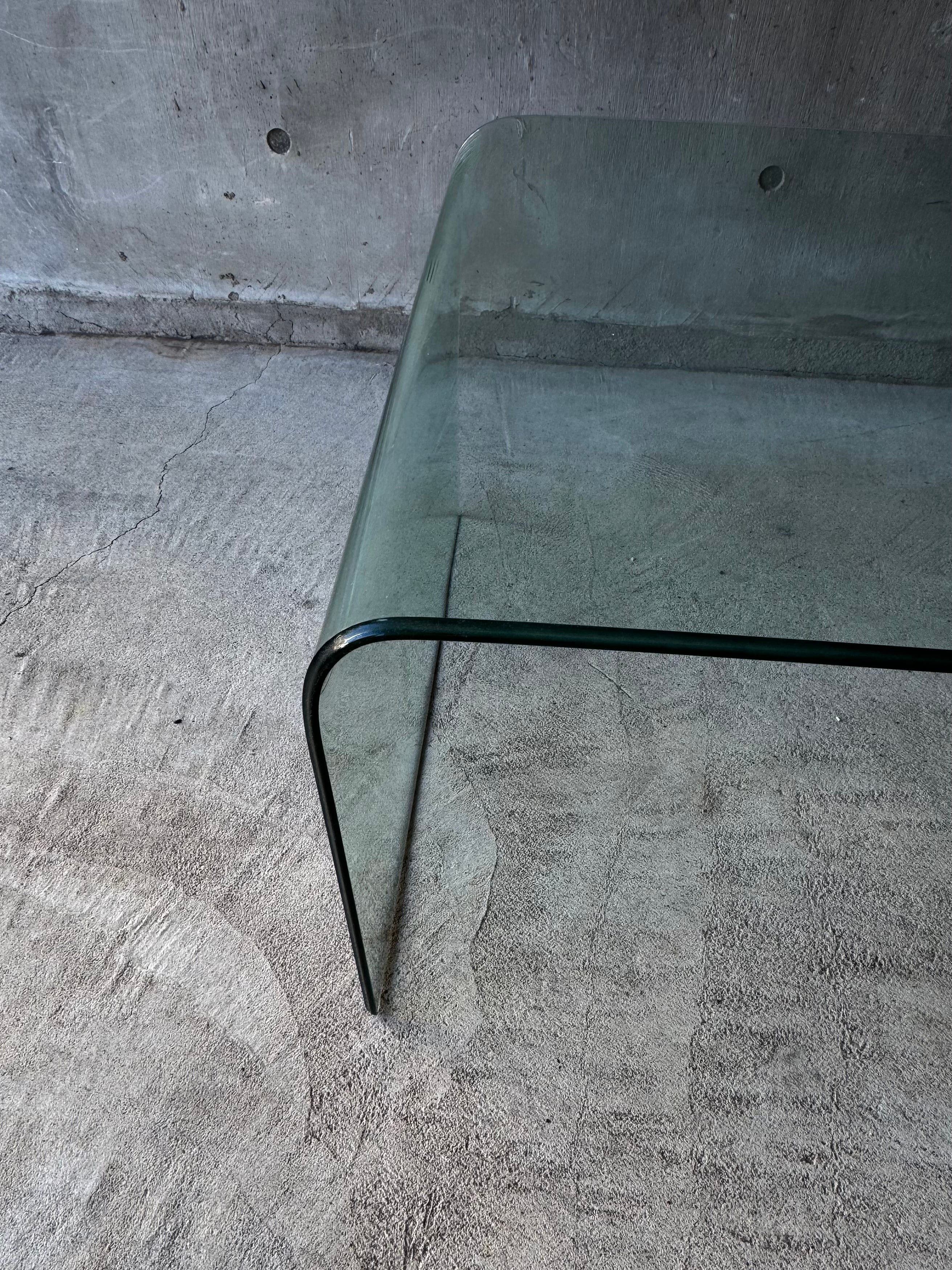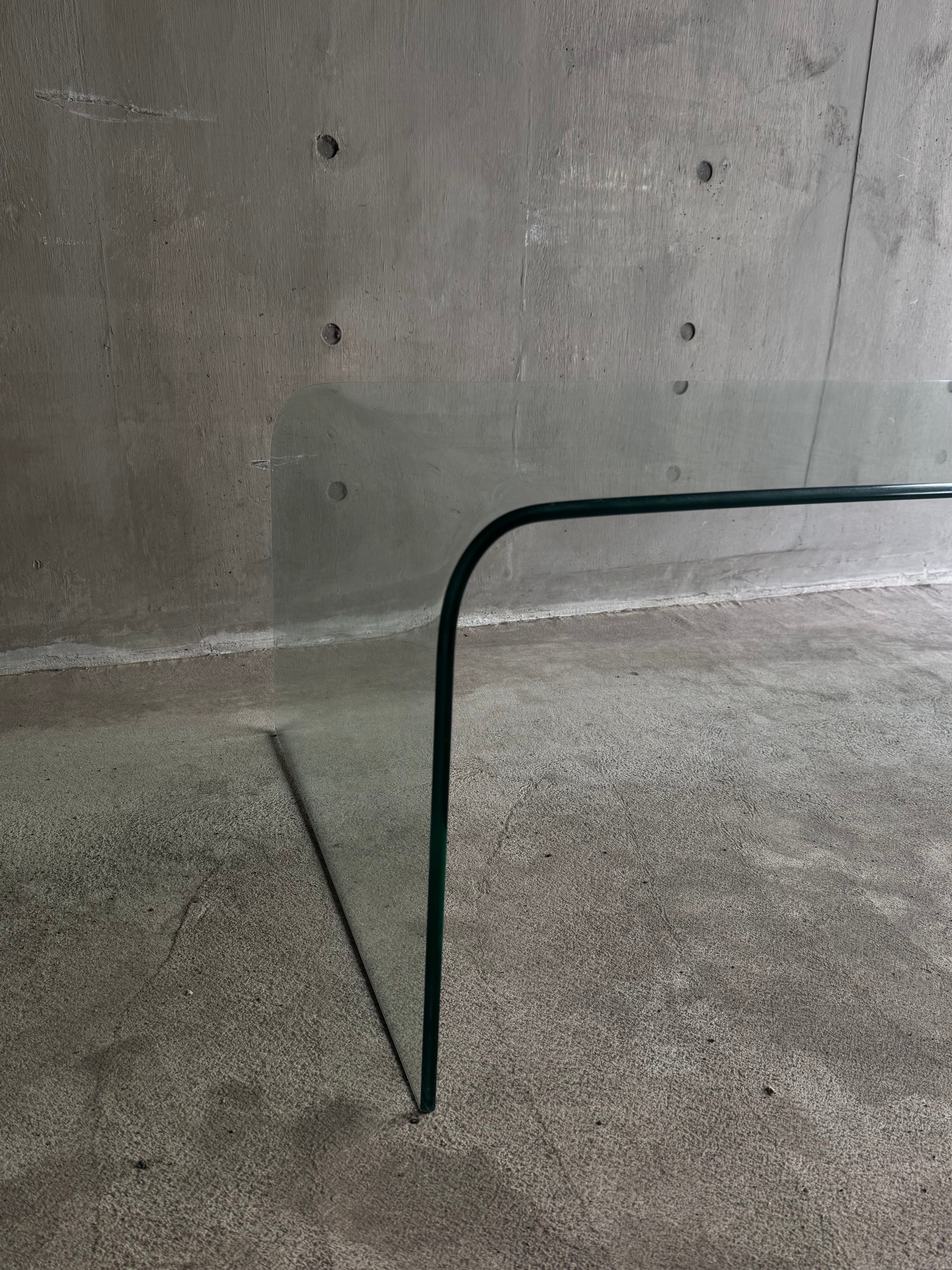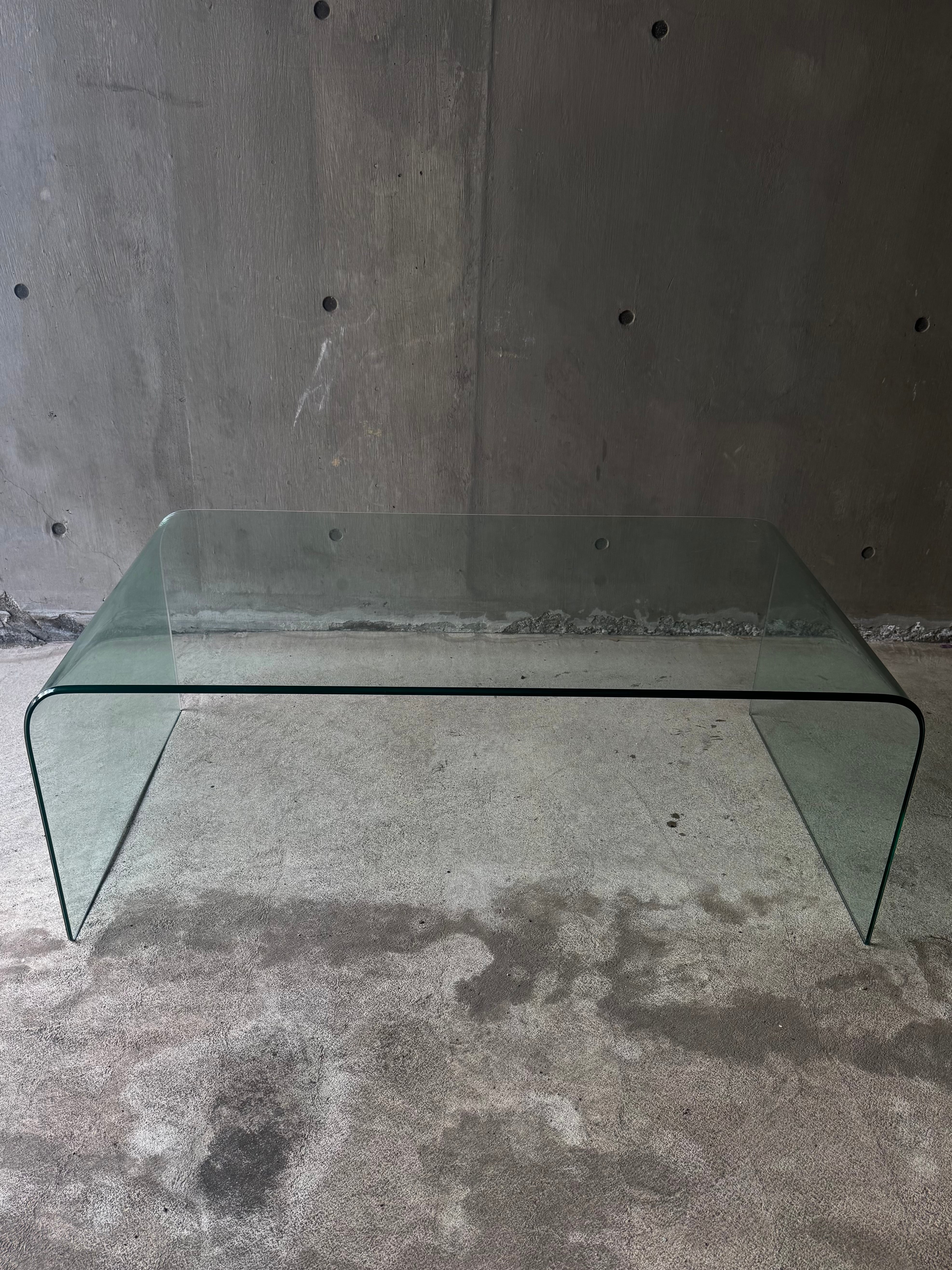 1枚のガラスから成形されたローテーブルです。緩やかに曲げられたガラスはお部屋に良い雰囲気を与えてくれます。サイズがあり、厚みのあるガラスが使用されているため、存在感がありながら空間を広く見せてくれます。ガラスやアクリルアイテムは好きでセレクトしていますが、何を置いても許容してくれるのが好きです。お気に入りのマグカップや本など置いて頂いても絵になるかと思います。
