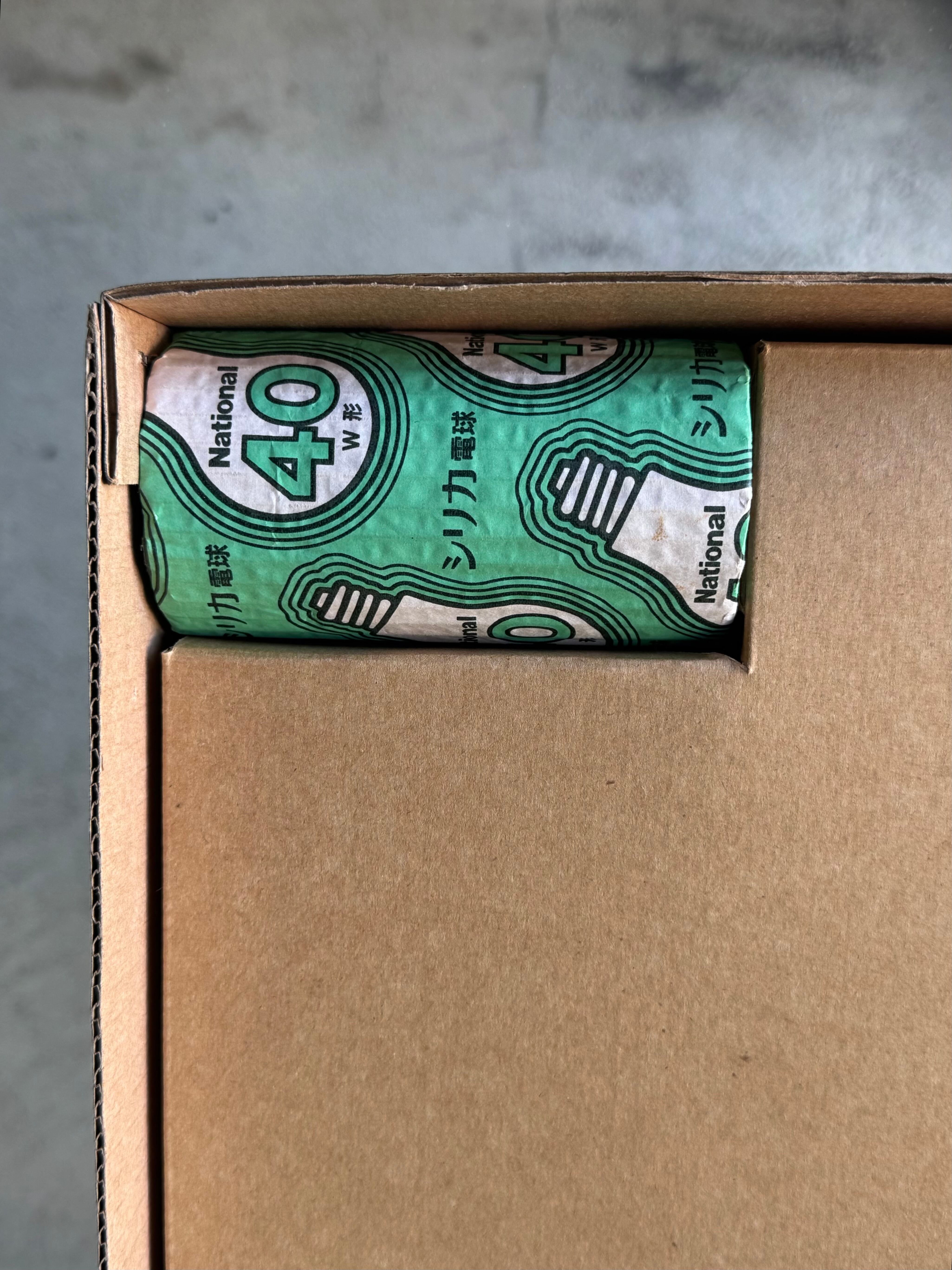 UFシリーズは1980年代からデザインされ、スパイダーレッグと呼ばれる脚が特徴です。この個体も1992年以前のアイテムになります。現オゼキの前身である尾関次七商店の表記で、プルスイッチのため現行品とは異なる点が多いです。箱ありで、付属の電球もナショナル製です。
